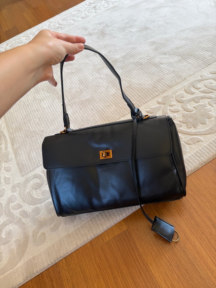 Klasik ve şık ofis tarzına uygun, tokalı tasarıma sahip siyah deri kadın çanta. Tek saplı ve kapaklı yapısı ile kullanışlıdır. Uzun askısı da var. Suni deri