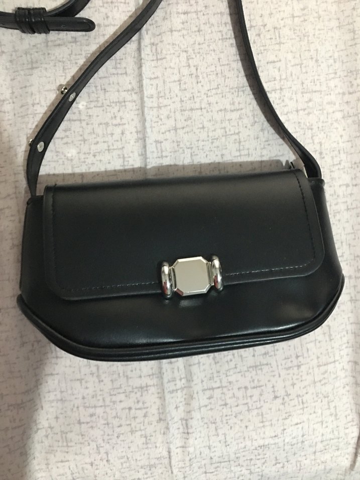Bu siyah deri kadın çantası tokalı kapak ve minimalist tasarıma sahiptir. Modern klasik tarzı, günlük kullanım için şık ve sade bir seçimdir.