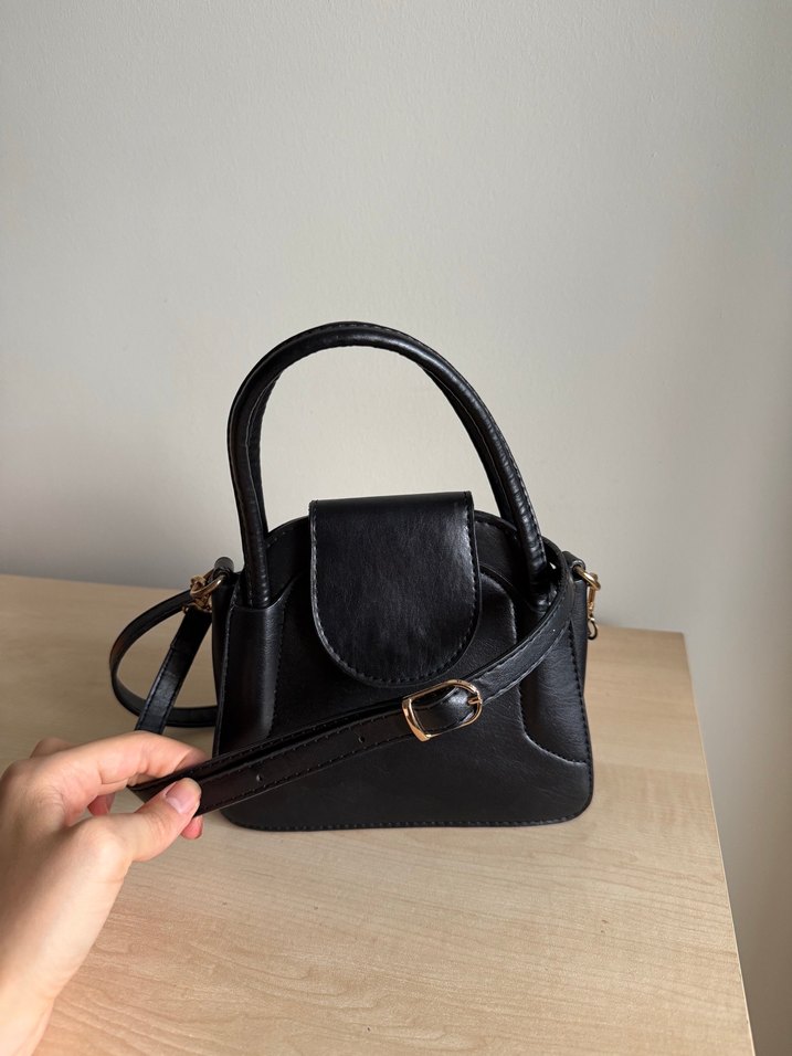 Siyah deri çanta, tokalı askısı ve minimalist, modern klasik tarzıyla günlük kullanıma uygundur.