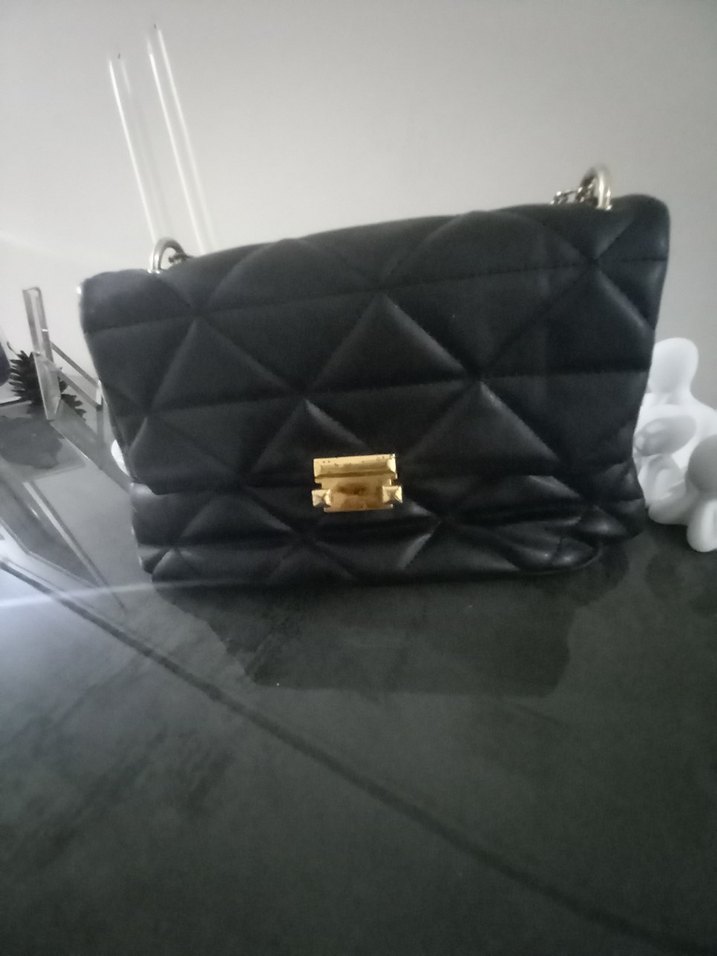 Siyah deri kadın çanta, kapitone detaylı ve altın tokalıdır. Minimalist, klasik streetwear tarzı için uygundur.