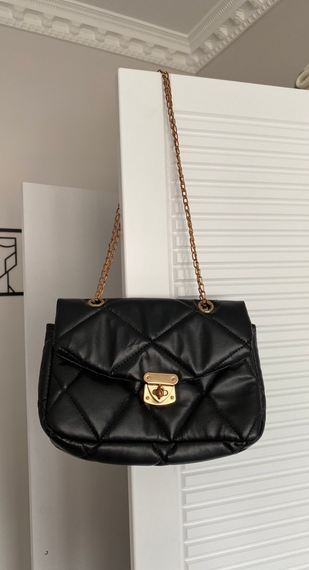 Siyah deri kadın çanta, kapitoneli tasarım ve altın tokalı kilit detayına sahip. Altın zincir askısı ile sokak stiline uygun, günlük kullanıma ideal.
