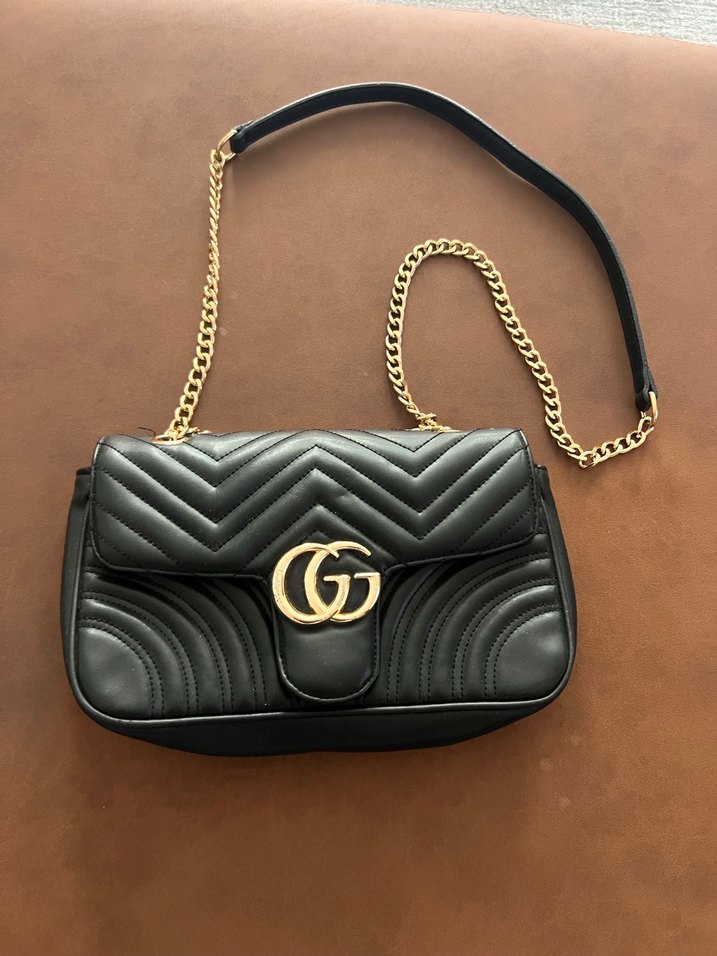 Klasik tasarımlı siyah deri kadın çanta, tokalı kapak ve altın zincir askıya sahiptir. Günlük kullanım ve sokak modası için uygundur.