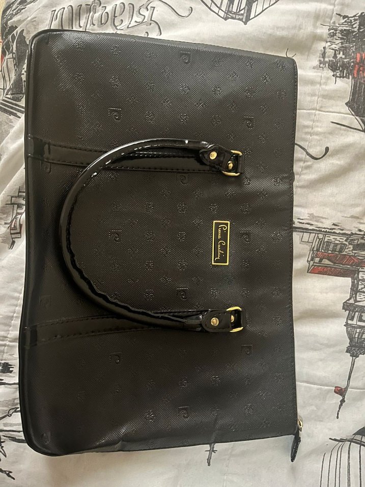 Klasik zarafeti yansıtan, siyah deriden yapılmış, baskılı desene ve tokalı saplara sahip kadın çantası.