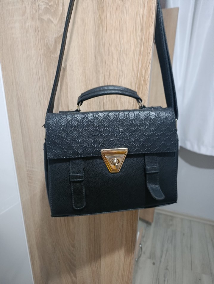 Yılan desenli, tokalı siyah deri kadın çanta, klasik zarafete uygun.