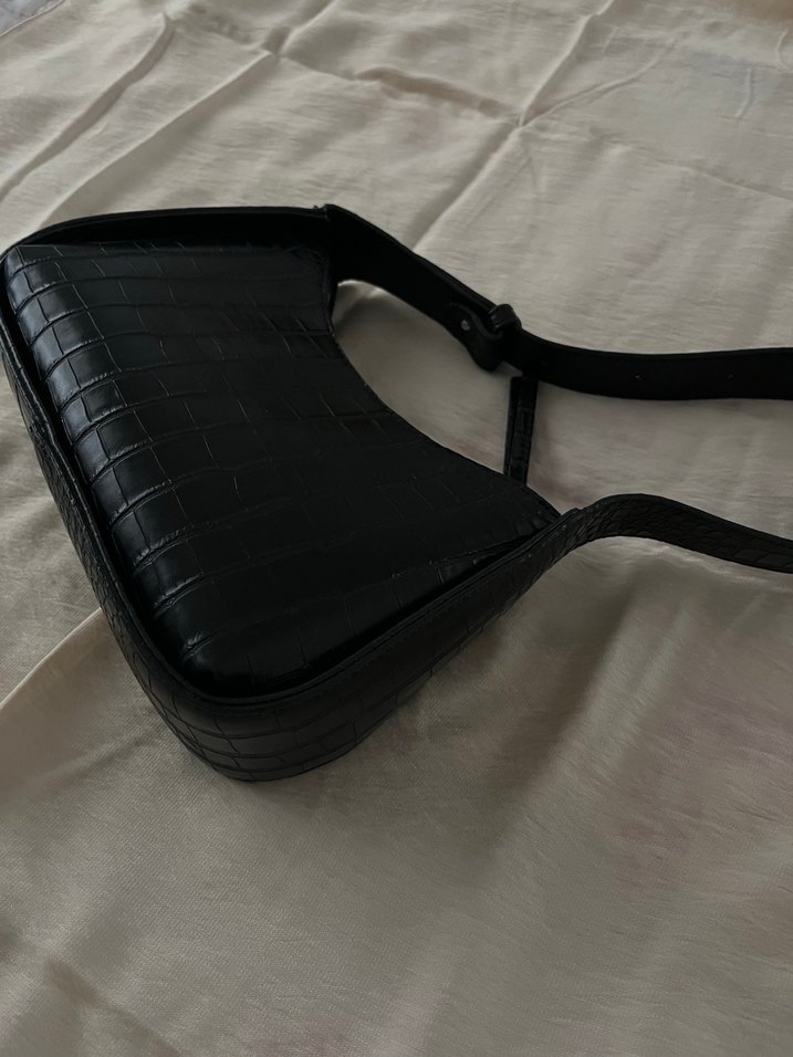 Koyu siyah deri, yılan deseni ve tokalı detaylara sahip kadın çantası, minimalist gotik tarzıyla günlük kullanıma uygundur.