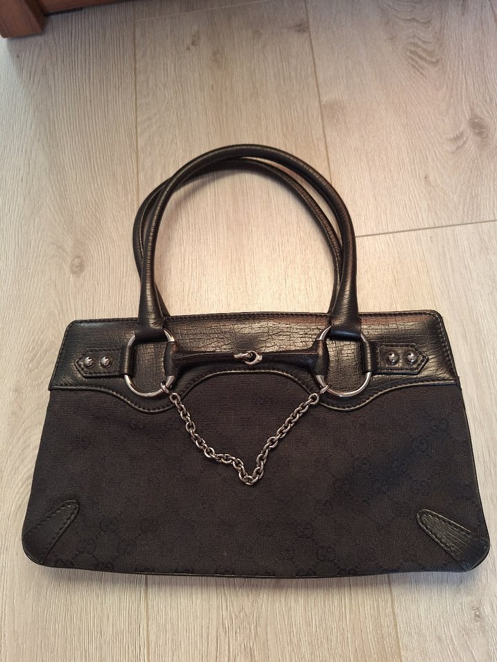 Klasik ve gotik tarzda, siyah deri kadın çanta, tokalı detaylar ve zincir aksanıyla ofis kullanımı için uygun.