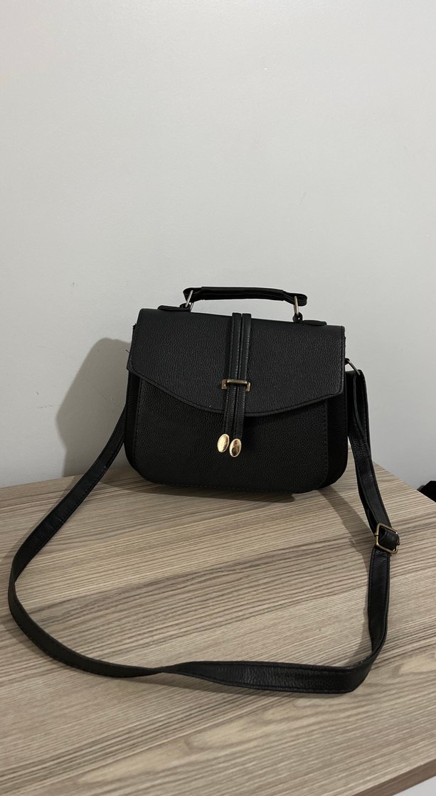 Klasik siyah deri kadın çantası, tokalı kapak ve elde taşıma sapı ile minimalist ve modern klasik tasarıma sahiptir.
