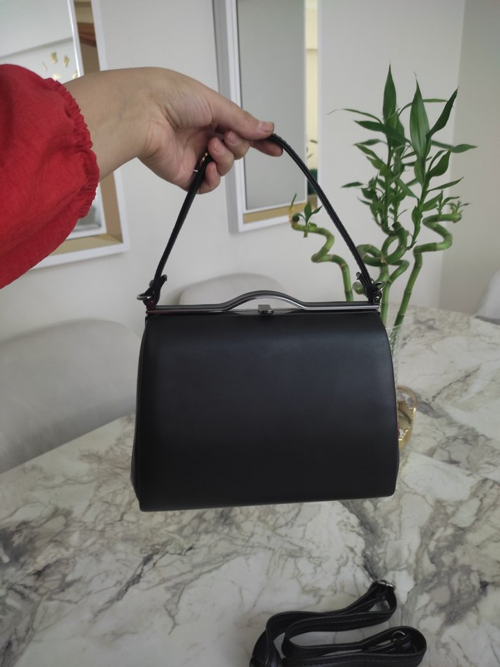 Siyah deri, tokalı klasik elegan kadın çantası, günlük kullanım için uygun ve goth tarzını yansıtır.