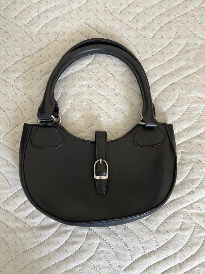 Siyah deri kadın çanta, tokalı kayışı ve desensiz yüzeyiyle klasik zarafeti gotik Paris tarzıyla yansıtıyor.