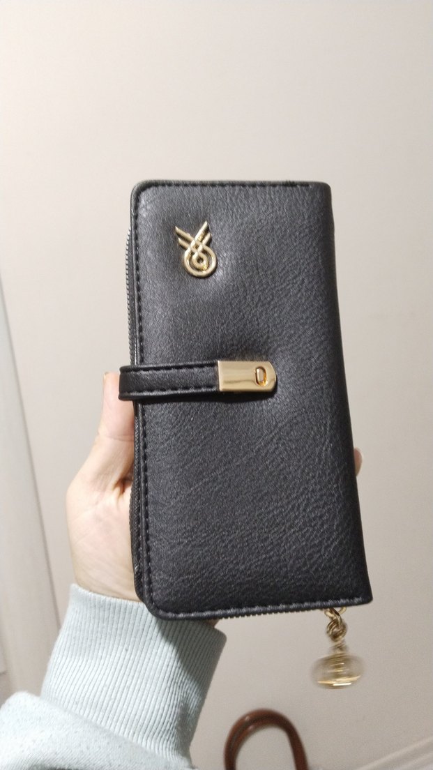 Klasik şıklık ve sokak modasını birleştiren, tokalı kayışlı ve baskılı detaylara sahip siyah deri kadın cüzdanı. Günlük kullanım için uygundur.