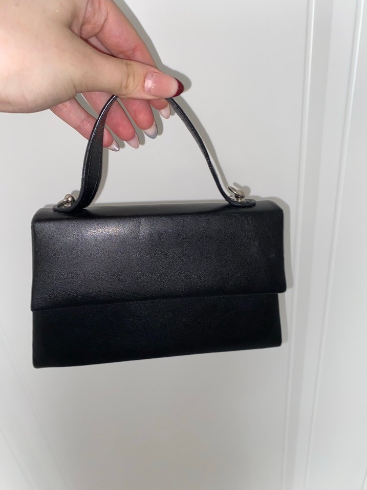 Siyah deri, tokalı saplı kadın el çantası. Düz ve desensiz tasarımıyla klasik ve şık bir stil sunar. Romantik akşamlar için uygundur.