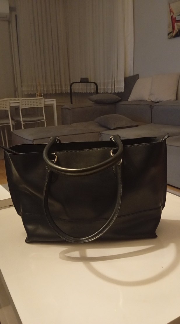Klasik gotik tarzda, tokalı ve düz dokulu siyah deri kadın ofis çantası.