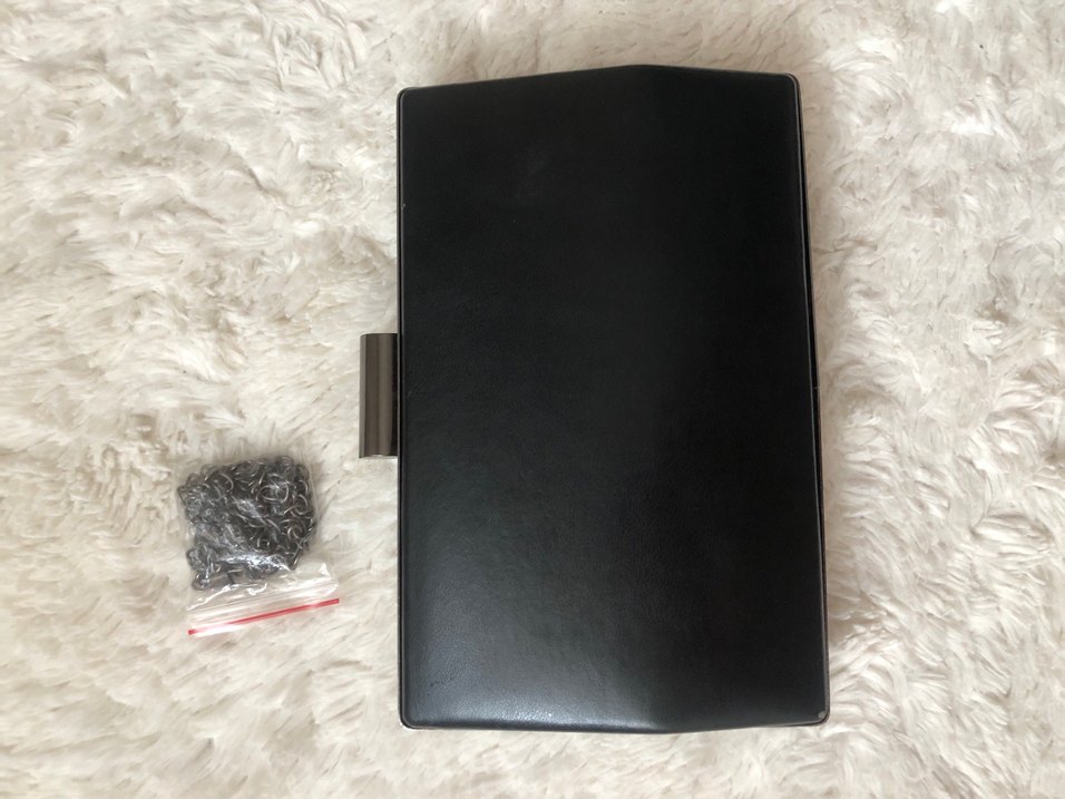 Siyah deri, kürk detaylı kadın portföy çanta. Minimalist ve çağdaş tasarıma sahip, ofis kullanımı için uygun, desensiz ve metal tokalı.