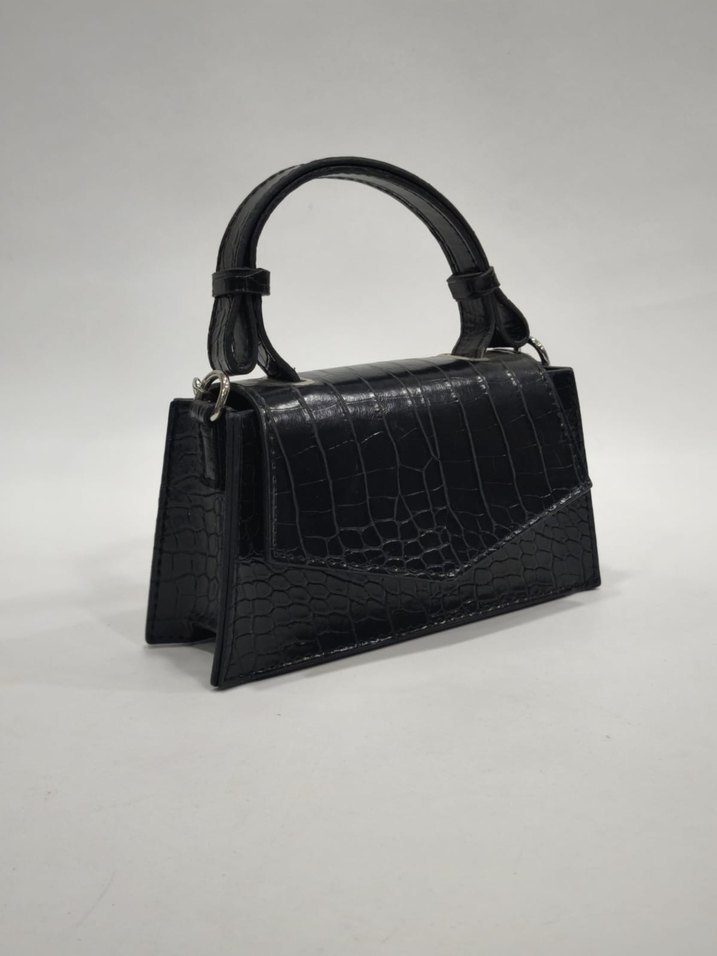 Siyah deri, krokodil desenli, tokalı saplı kadın çantası, klasik zarafet ve çağdaş Paris tarzını bir araya getirir.