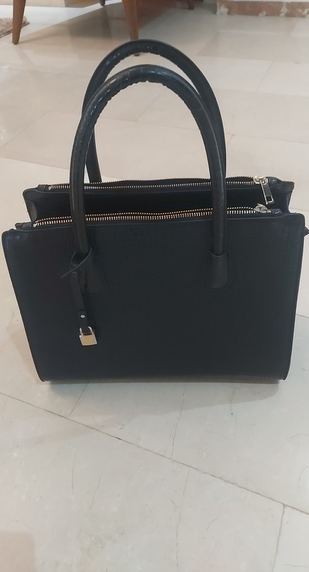 Siyah deri, fermuarlı bölmeli, çağdaş ve klasik ofis tarzına uygun kadın çantası. İş ortamları için ideal.