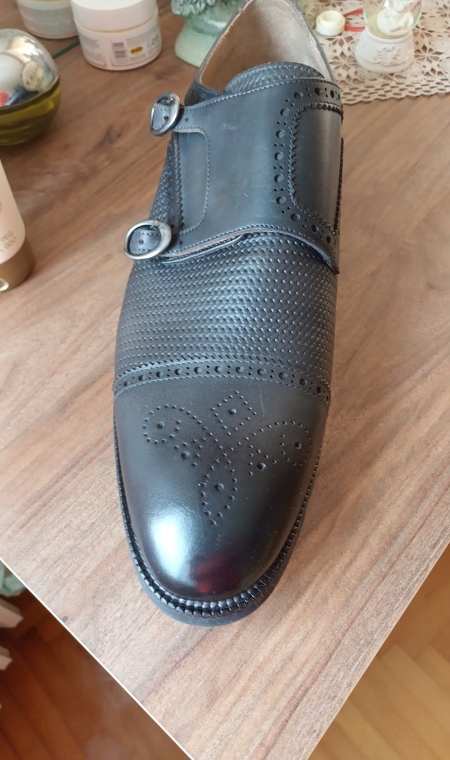 Siyah deriden yapılmış, tokalı ve detaylı delikli desenlere sahip klasik erkek ayakkabısı. Ofis kullanımı için uygun, geleneksel ve şık tarzda.