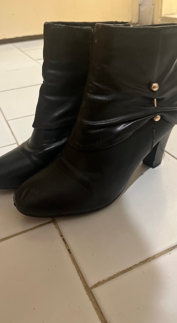 Siyah deri, tokalı ve blok topuklu kadın botları, desen içermeyen, gotik ve klasik zarafeti bir araya getirir. Günlük kullanıma uygundur.