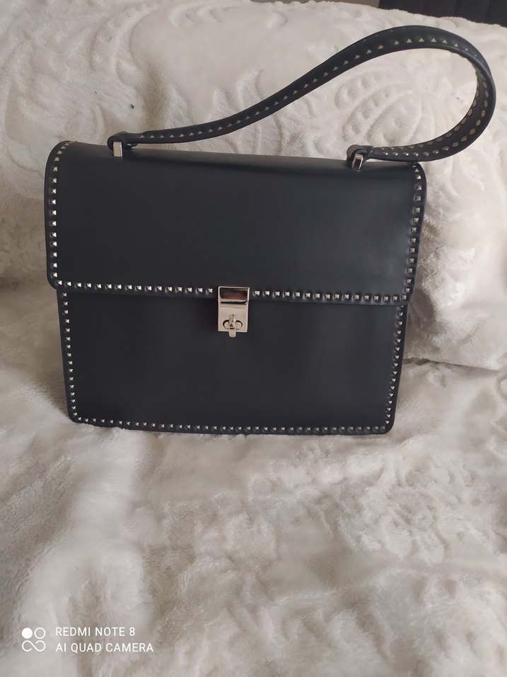 Klasik zarafeti ve gotik dokunuşu yansıtan, tokalı ve perçin detaylı siyah deri kadın çantası. Günlük kullanıma uygun.