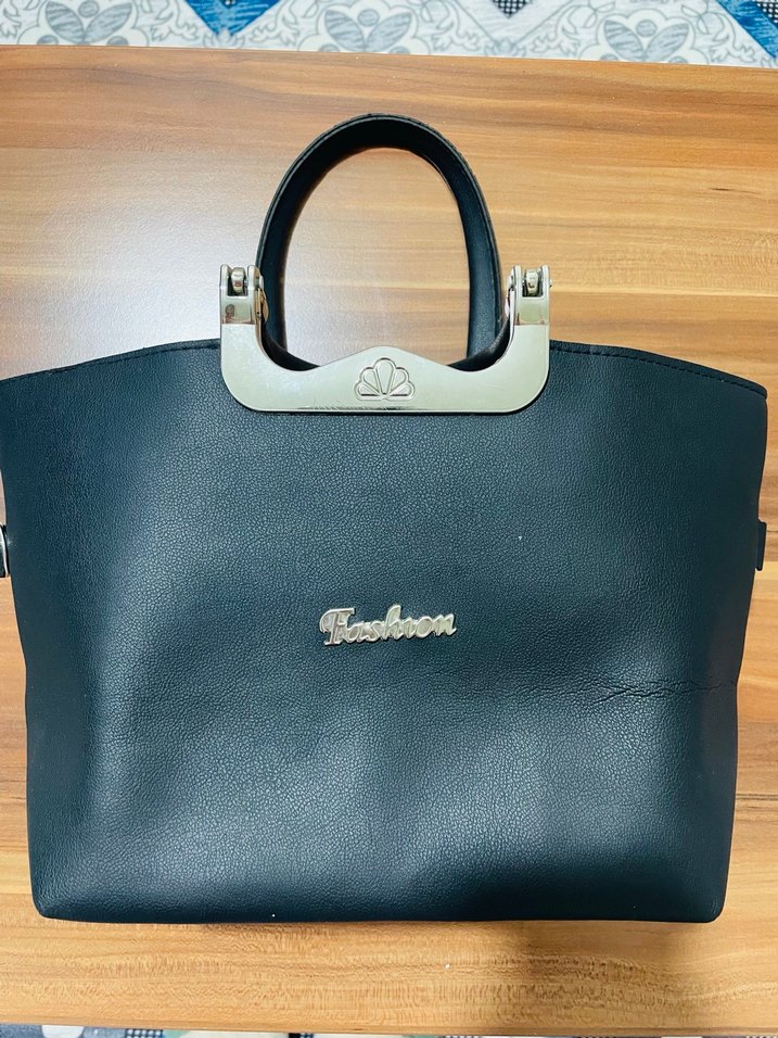 Klasik tarzda, tokalı saplı siyah deri kadın çanta. Parlak yüzeye ve baskılı desene sahiptir, günlük kullanıma uygundur.