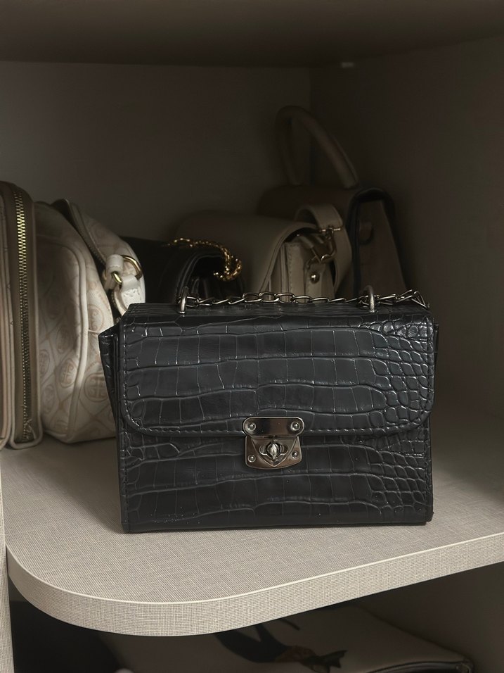 Klasik zarafeti yansıtan siyah deri, yılan desenli, tokalı kadın çanta. Paris sokak stiline uygun, günlük kullanıma ideal.