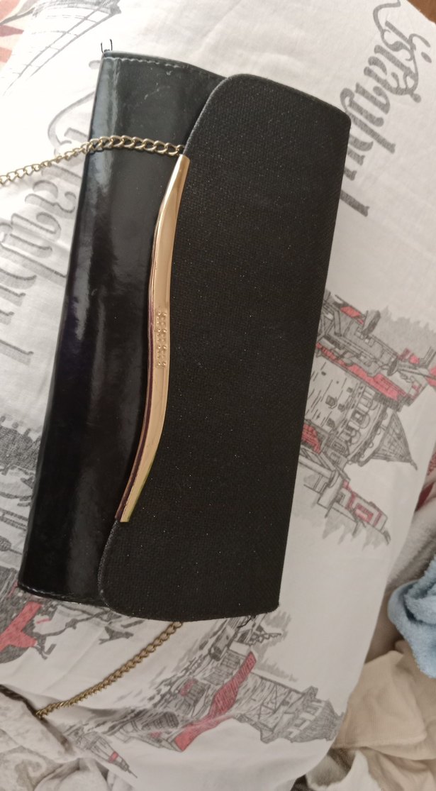 Siyah deri, tokalı ve baskılı desene sahip kadın clutch çanta. Romantik gece ve klasik zarafet için ideal, gotik stil ve Paris etkisiyle.