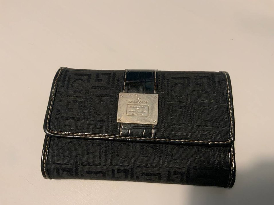 Ofis kullanımı için uygun, baskılı desene ve tokalı kapamaya sahip siyah deri kadın cüzdanı, Paris tarzı esintili.