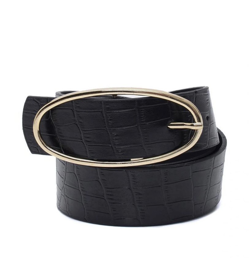 Altın oval tokalı, dokulu siyah deri kadın kemeri, çağdaş Paris tarzını yansıtır.