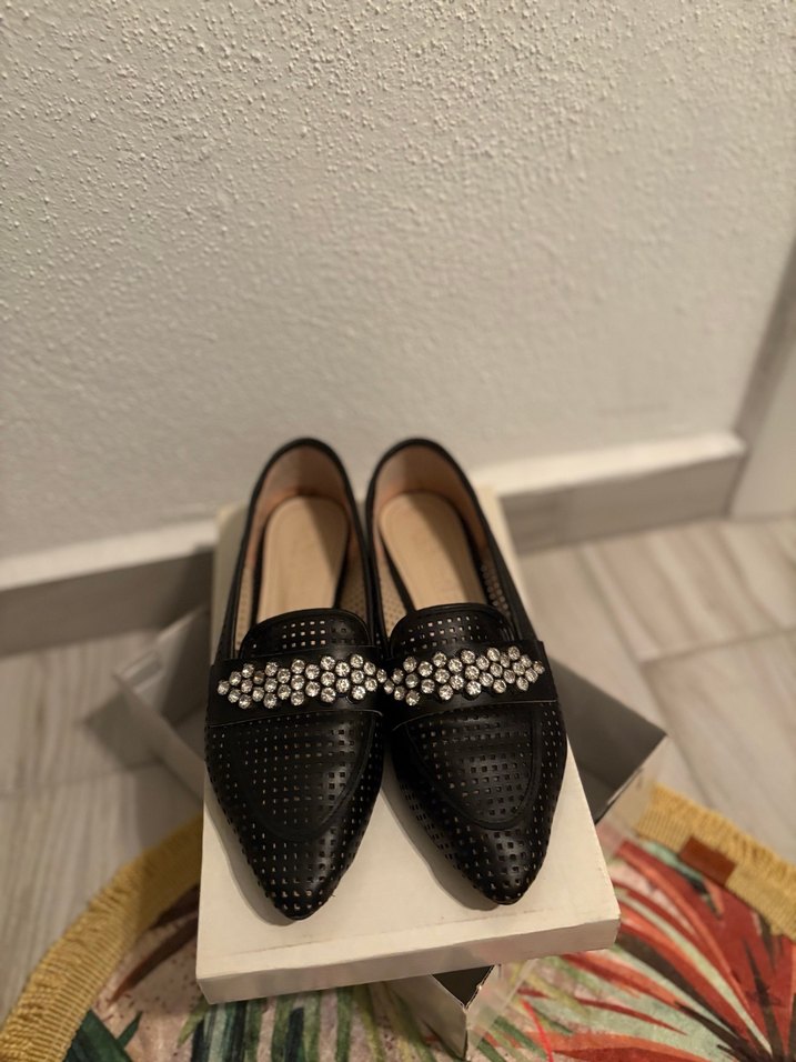 Siyah deri, tokalı ve ince topuklu sivri burunlu kadın babet.1-2 kez giyilmiştir sorunsuzdur.