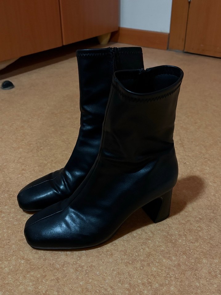 Siyah deri, tokalı, blok topuklu botlar. Topuğu yüksek değil,rahatlıkla yürünüyor. 1 kez giyildi artık tarzıma uygun olmadığı için satıyorum