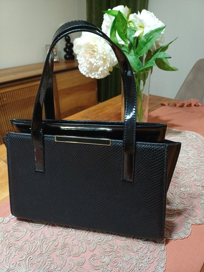 Koyu yılan desenli siyah deri çanta, tokalı detaylarıyla klasik zarafeti modern klasik stil ile buluşturur.