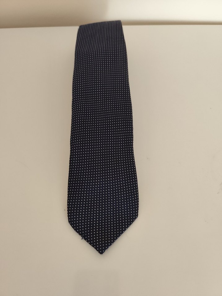 Koyu siyah taban üzerine ince nokta desenli, iş ve klasik sokak tarzına uygun erkek kravatı.