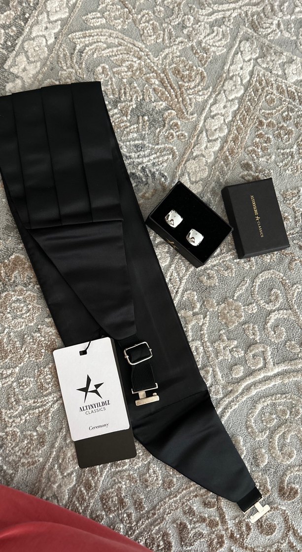 Ayarlanabilir bantlı, siyah desenli erkek papyonu ve gümüş renkli kol düğmeleri. Herhangi bir defosu yoktur ürün sıfırdır