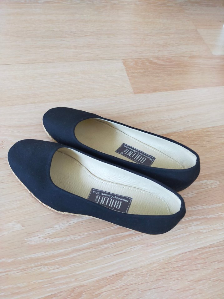 Siyah renkte, dolgu topuklu ve kauçuk tabanlı kadın espadril ayakkabılar, günlük kullanım için rahat ve şık bir seçenektir.
