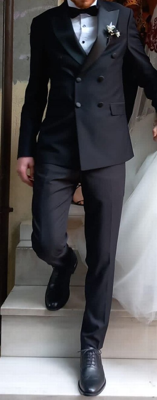 Siyah renkli, düğmeli ön kısmı ve klasik yaka detaylı erkek takım elbise. Orta boyda, düz kesim ve desen içermeyen modern tasarım.pazalik payı vardır gömlelegide var istenirse terzi Ahmet altun marka