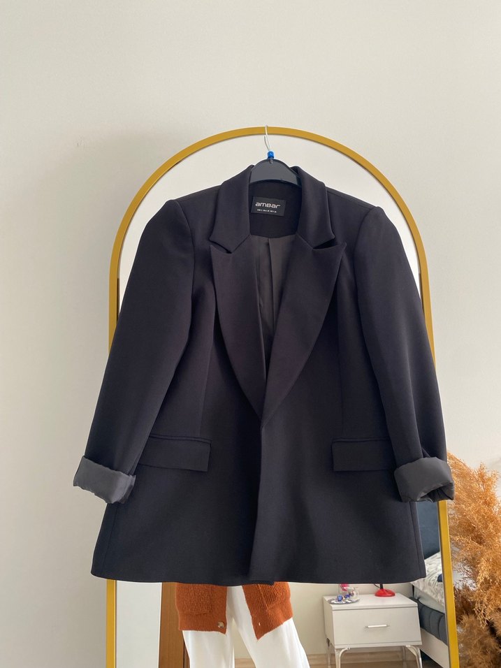 Bu siyah kadın blazer ceket, kesik yaka ve uzun kollu düğmeli ön tasarıma sahiptir. Orta uzunlukta ve rahat kesimdir, yumuşak ve sıcak kumaştan üretilmiştir. markası belirsz