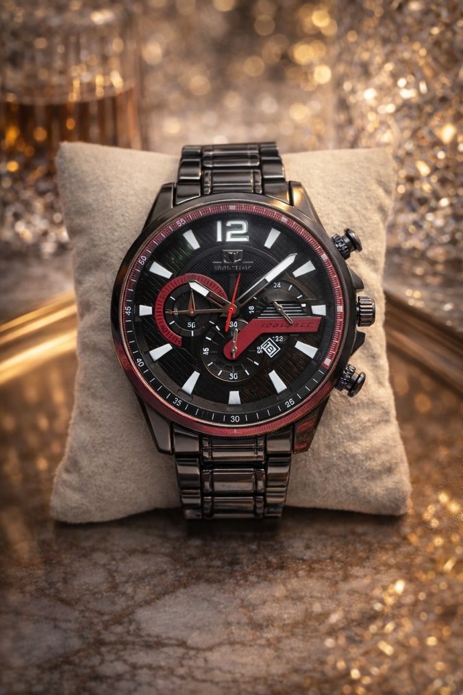 Klasik ve biker tarzını yansıtan, kronograf ve tarih göstergeli yuvarlak kadranlı, koyu siyah metal bilezikli erkek saat. ⌚