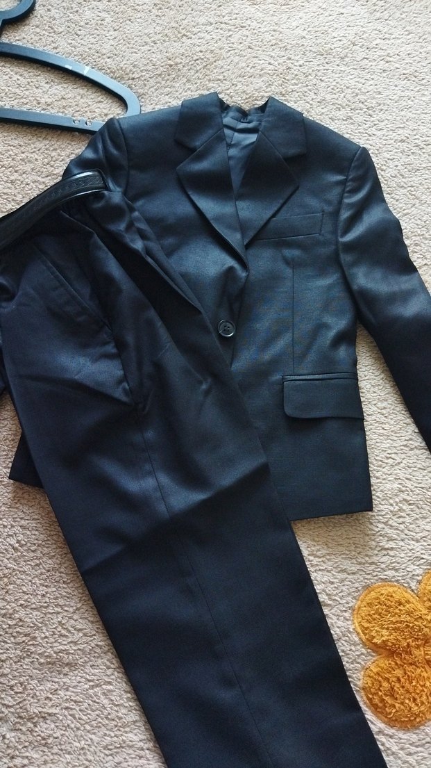 Siyah erkek takımı, klasik kesim ve kırık yaka ile. Düğmeli ve askılı kollu, ofis için uygun bir model. ️