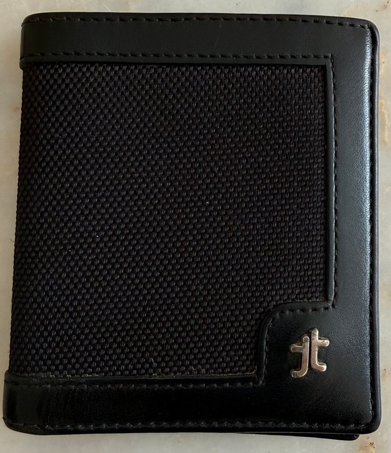 Dokulu kumaş panel ve deri kenarlara sahip siyah erkek cüzdanı, metal logo detaylı. İş ve sokak modasına uygun.