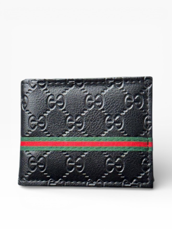 Yılan derisi desenli, siyah erkek cüzdanı, yeşil-kırmızı-yeşil şerit detayı ile klasik ve sokak stilini birleştirir.