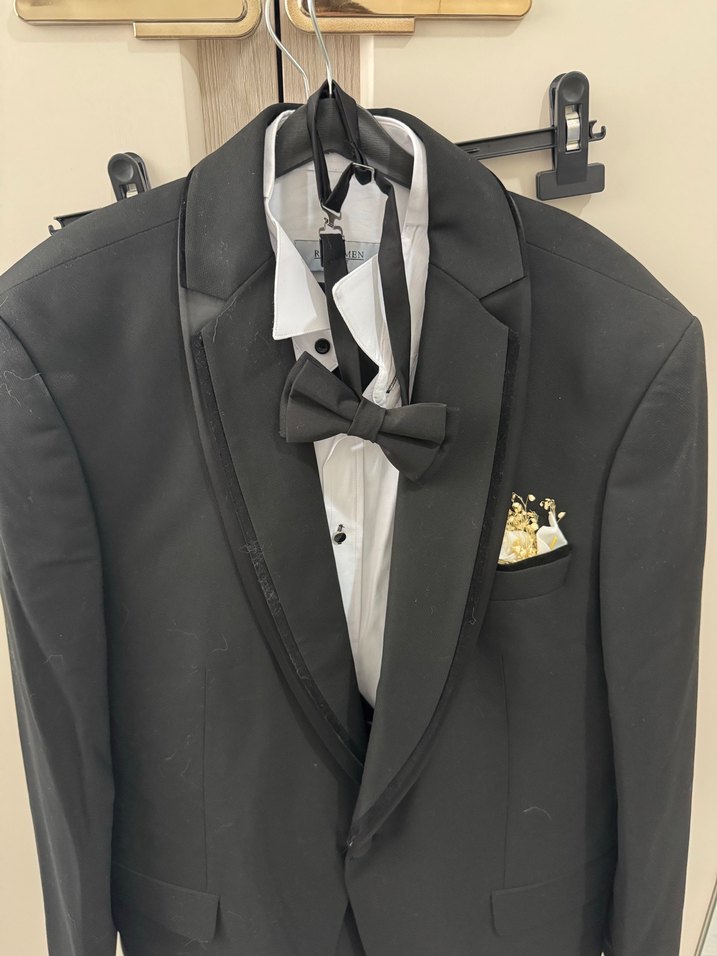 Klasik şıklıkta, siyah damat takımı. Düğmeli, notched lapel yaka ve normal boy midi kesim. Ofis ve resmi etkinlikler için uygun. ️