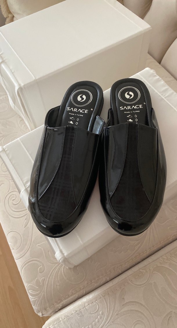 Tokalı ve yılan desenli siyah erkek ev terliği. SARACE markasının iç tabanda logosu yer alır. Sokak stili için uygundur.