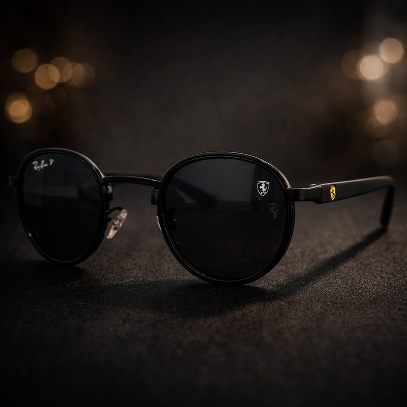 Yuvarlak camlı, siyah klasik erkek güneş gözlüğü, Ferrari logosu detaylı, rock punk tarzına uygun. ️
