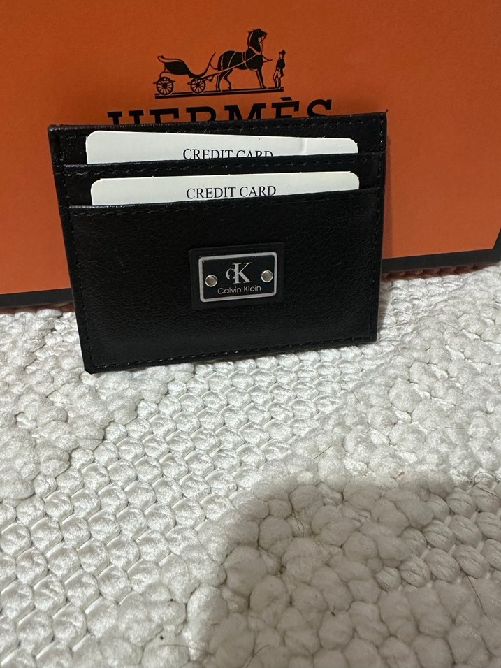 Klasik biker tarzında, çoklu kart bölmeli, tokalı siyah erkek kartlık. Calvin Klein markalı ve baskılı desene sahip.