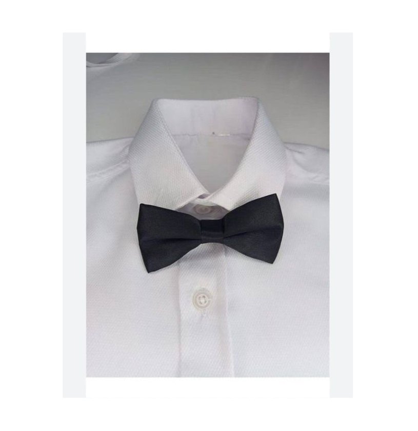 Beyaz gömlekle kombine edilmiş, düz ve klasik tasarımlı siyah papyon. Gotik tarz için uygun, sade ve desensiz görünüme sahip.