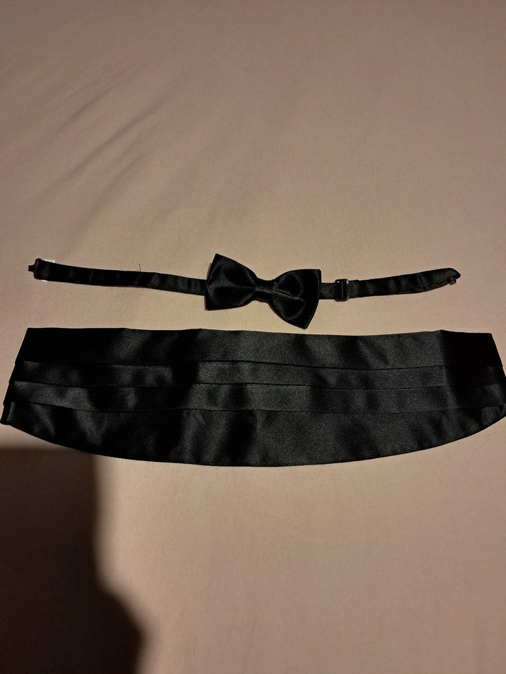 Klasik tarzda, siyah ve düz kumaştan yapılmış papyon ve uyumlu kemerden oluşan set.