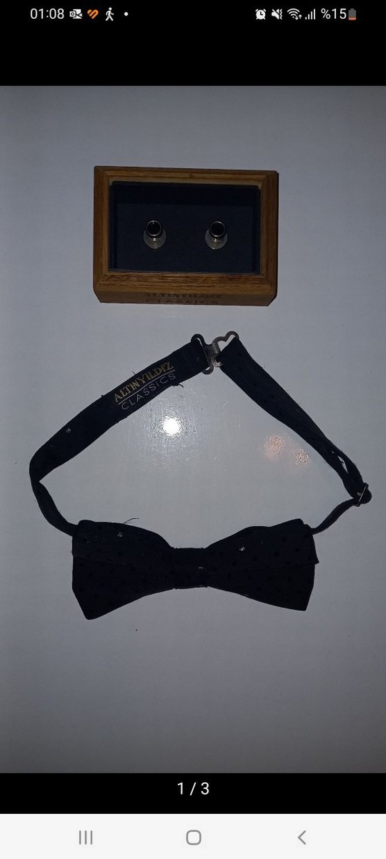 Ayarlanabilir bantlı siyah klasik erkek papyon, zamansız ve şık bir görünüm sunar. Ahşap kutuda uyumlu kol düğmeleri ile birlikte.