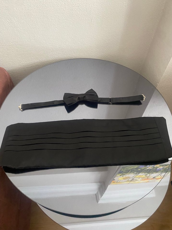Siyah, deseniz erkek papyon ve uyumlu kuşak seti, klasik şıklığı yansıtan düz kumaştan yapılmıştır.