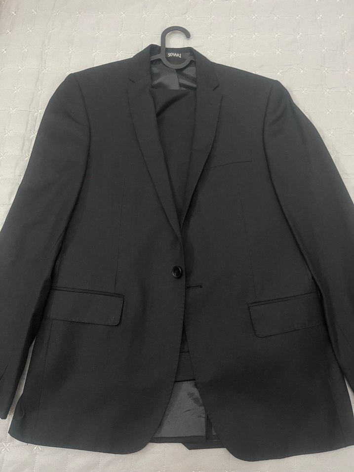 Düğmeli, klasik yakalı siyah erkek takım ceketi. Normal boy ve regular fit, uzun kollu, iş ortamına uygun.