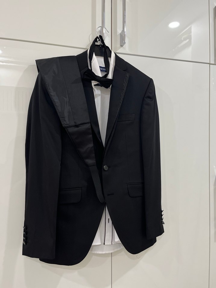 Siyah renkli, klasik kesim erkek takım elbise. Kemer detaylı, normal boyda, strappy kollu ve çentikli yaka bir kez giyildi novio marka