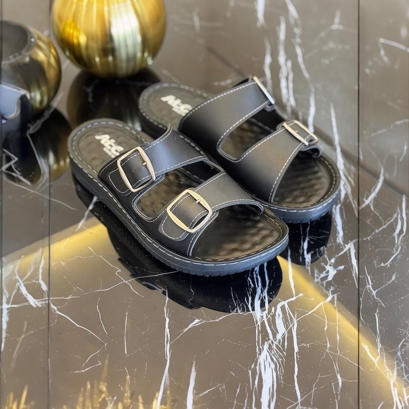 Siyah renkli, tokalı kayışlara ve hafif yılan derisi desenine sahip, kauçuk malzemeden üretilmiş klasik erkek terlikleri. Günlük ve sokak stiline uygun.
